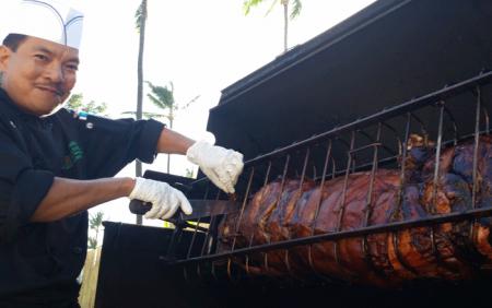The call of the pu (conch shell) gathers guests for a shell lei greeting by na mea Hookipa (friendly hotel staff) and a welcome Mai Tai, Blue Hawaii cocktail or Tropical juice. An abundant feast of island fare, prepared by award-winning chefs, features Whole Roasted Huli Huli Pig from a Kiawe Rotisserie, Kaanapali Beach Hotel's famous Poi made in-house, an enticing variety of Hawaiian specialties, fresh island fruits and salads, and scrumptious desserts. There is an open bar featuring Mai Tai and Blue Hawaii cocktails, beer, wine and soft drinks. Full bar offerings are available for an additional fee.