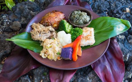 Menu:Polynesian Menu: All-you-can-eat buffet features, Imu Kalua Pork; Huli Huli Chicken; Macadamia Nut CrustedIsland Fish, Polynesian Fried Rice; Makamaka Vegetables; Molokai Purple Sweet Potato; Creamed Taro & Leaf withCoconut Milk; Soba Noodle Salad; Fresh Sliced Tropical Fruits; Lomi Lomi Salmon; Pacific Ahi Poke, Kauai Taro-Pounded Poi; Upcountry Baby Green Lettuces; Namasu of Maui Onions, Cucumbers and Carrots; Taro rolls withWhipped Lilikoi Butter Keiki Buffet: Chicken Nuggets; Penne MarinaraSweets: Dessert table features, Creamed Chocolate Macadamia Nut Brownie; Coconut Haupia with Toasted Coconut;