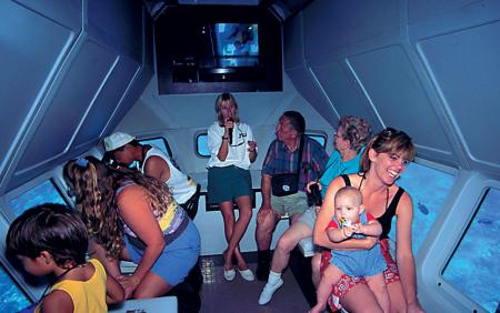 The first of its kind to be built, it offers many unique features including 38 windows with 280° viewing for full visual enjoyment. The cabin allows spacious seating and headroom, and of course you are free to move about the vessel for upper and lower deck seating. Divers will go out and bring exotic marine life for your viewing pleasure!