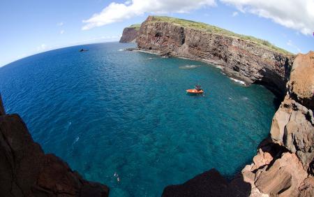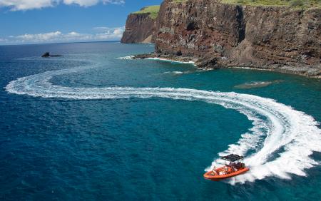 Maui Activities - Ranked #1 Lanai attraction by TripAdvisor.com, this increadible Lanai Dolphin Rafting Adventure is one of the most innovative and exciting trips from Maui to Lanai and Molokai. You'll explore Maui's best ocean rafting cruise and discover the islands wildest coastlines, secluded beaches, Lanai shipwrecks and crystal clear snorkeling waters. If you're lucky, you might even get to swim with dolphins.Oh yeah... Dolphins, dolphins and MORE dolphins! Did we mention green sea turtles, monk seals and whales (in season)? These are just a few of the possible exotic sea-life encounters you might enjoy. This is one of the most unique and extraordinary Maui rafting tours, since this is the only HBI circumnavigating Lanai and the only boat that consistantly sees the whole island year round. No other boat has or does circumnavigate Lanai more than this tour does! Your Lanai raft journey will begin at 6:30 a.m., when you'll depart from Mala Wharf in Lahaina. You better hold ontight because you're in for a rafting adventure you'll never forget! The first part of your venture is along the north shore of Lanai, the home of the spinner dolphins. Crossing the AuAu channel and down the windswept coast where miles of isolated white sandy beaches beckon you ashore for exploration. The rushed hulls of the shipwrecks down this coast line date back to World War II. You'll continue around the leeward side of the southwest coastline where you'll get to skim within a few feet of towering seacliffs and lava rock out crops. Numerous coves along the leeward side of Lanai offer splendid snorkeling where marine creatures of all types can be found. Anyone of these spots offers a remote and secluded setting for lunch. Sea caves, burial caves, blowholes, tidepools, spinner and spotted dolphins, monk seals, shipwrecks and white sandy beaches make this trip a must for everyone. You'll be journeying into the wild heart of Hawaii very few ever get to experience. - Check-in time: 6:30 AM at the Mala Wharf in Lahaina