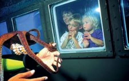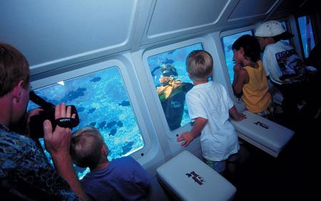 The first of its kind to be built, it offers many unique features including 38 windows with 280° viewing for full visual enjoyment. The cabin allows spacious seating and headroom, and of course you are free to move about the vessel for upper and lower deck seating. Divers will go out and bring exotic marine life for your viewing pleasure!