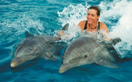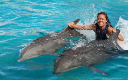 - This swim with dolphins program includes a foot push, where the dolphins propel you full speed across the water's surface while they push you from under your feet
