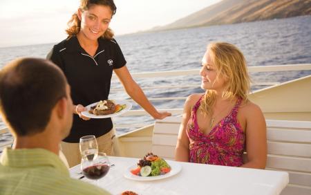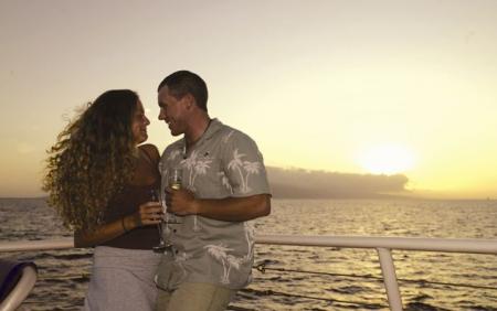 The price includes ice cold juices, soda, & filtered water. Adults 21 & over with valid photo ID also may enjoy up to three complimentary drinks consisting of white or red wine, locally brewed Maui Brewing Company beer, & tropical drinks and Mai Tais. Tour will depart from Lahaina Harbor at 5 PM and return at 7 PM (Check-in: 4:15 PM)