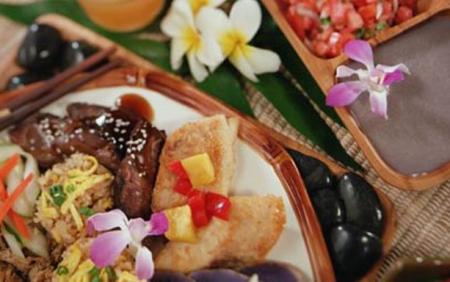 6:30pm Luau Feast The music continues while you enjoy traditional flavors and island favorites like kalua pork, beef teriyaki, chicken adobo, and sweet and sour mahimahi. Sample our ono local specialties like lomi salmon, fresh poi, Hawaiian sweet potato, mac salad, namasu salad and scrumptious tropical deserts!